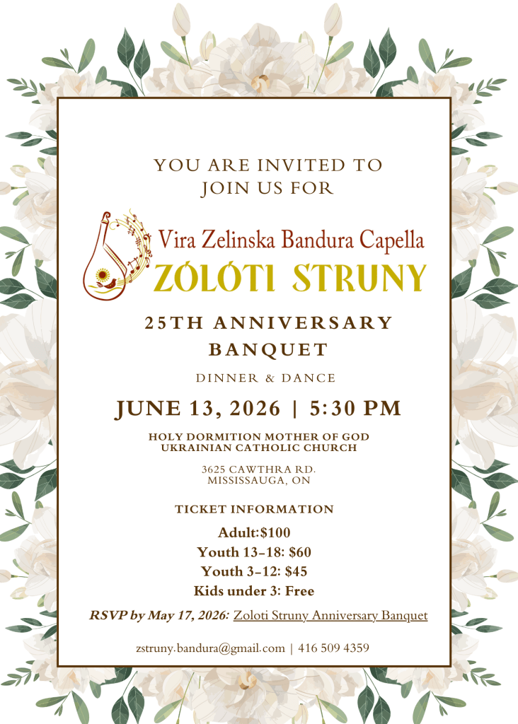 Vira Zelinska Bandura Capella “Zoloti Struny” will be holding their 25th Anniversary Banquet Dinner & Dance on Saturday, June 13, 2026, at the Holy Dormition of the Mother of God Ukrainian Catholic Church (3625 Cawthra Road, Mississauga, ON).