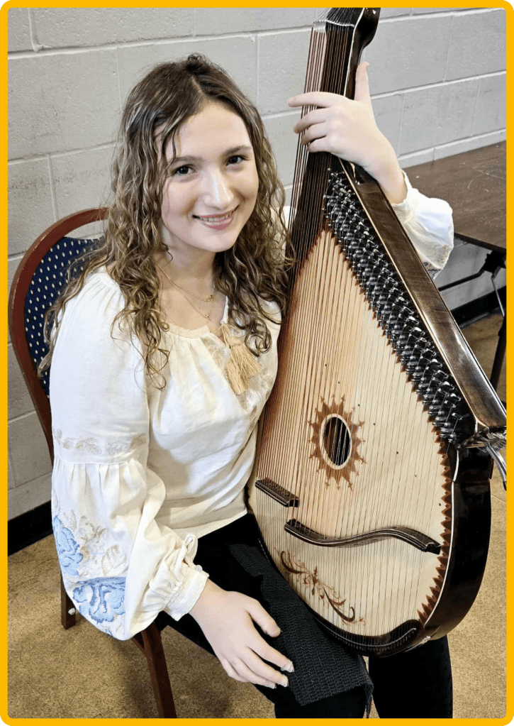 Solomia Shevchuk, a young rising artist, has been playing bandura for 11 years, beginning her musical journey at the age of five. She studies under the guidance of her teacher, Oksana Zelinska-Shevchuk, an experienced bandura instructor, whose mentorship has helped shape her growth as a dedicated and expressive performer. Throughout her musical development, Solomia has participated in numerous competitions and festivals, earning recognition for her skill, achievements and commitment. Annually, she has competed successfully in the Toronto Kiwanis Music Festival and the Marta Krawciw-Barabash Ukrainian Music Festival in Toronto, where her performances have been recognized with Platinum awards and top scholarships. With many years of experience and a strong passion for music, Solomia continues to refine her artistry and share her talent with her community.